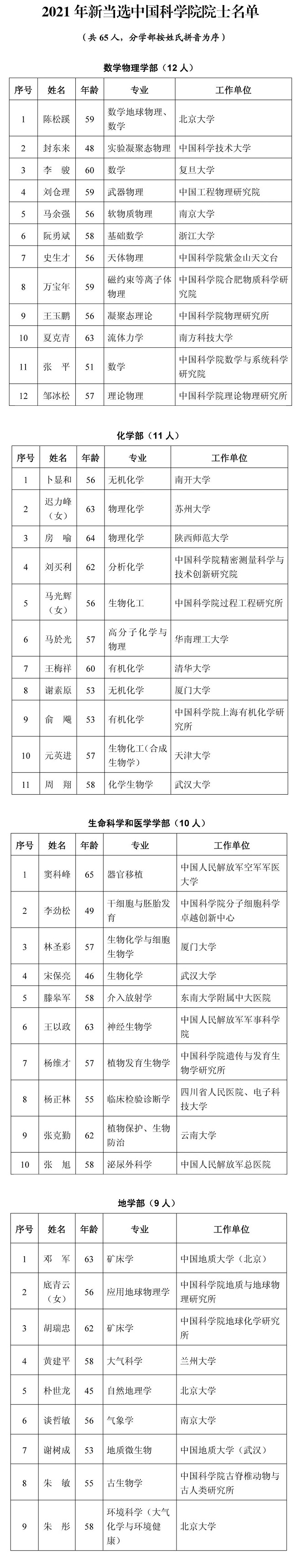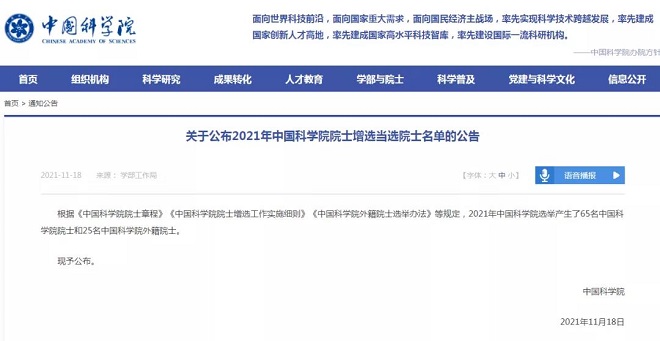 中國科學院根據《中國科學院院士章程》《中國科學院院士增選工作實施細則》《中國科學院外籍院士選舉辦法》等規定,于2021年選舉產生了65名中國科學院院士和25名中國科學院外籍院士。