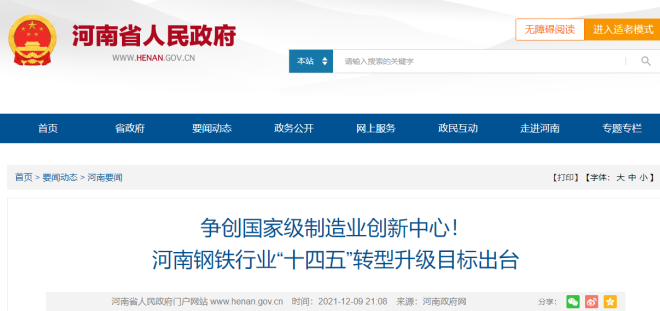 2021年底,河南省人民政府網(wǎng)站發(fā)布了《河南省鋼鐵行業(yè)“十四五”轉(zhuǎn)型升級(jí)實(shí)施方案》(以下簡(jiǎn)稱《方案》)。《方案》表示,到2025年,河南省鋼鐵行業(yè)綠色化、智能化、高端化、服務(wù)化水平進(jìn)一步提升,生產(chǎn)力布局和產(chǎn)品結(jié)構(gòu)進(jìn)一步優(yōu)化,生鐵產(chǎn)能控制在3000萬噸左右,粗鋼產(chǎn)能控制在4000萬噸以內(nèi),實(shí)現(xiàn)“兩減、兩降、兩優(yōu)”目標(biāo)。鋼鐵產(chǎn)能總量只減不增,鋼鐵冶煉企業(yè)數(shù)量只減不增。