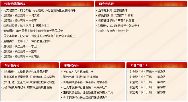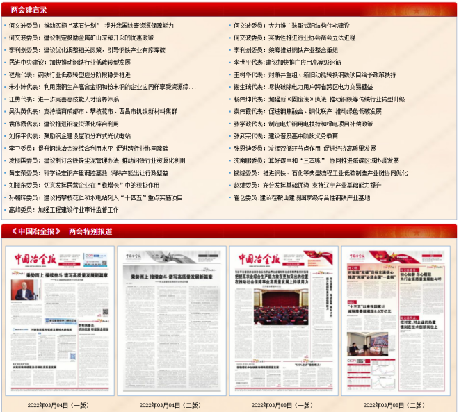 每年兩會,來自鋼鐵行業的代表和委員們認真履職,積極建言獻策,為行業高質量發展提出各項建議。今年的兩會已經結束。兩會期間,來自鋼鐵行業的全國人大代表、政協委員重點圍繞了行業雙碳、雙控、資源保障、產業鏈合作、行業布局兼并重組、科技創新等重點問題談了觀點及相關的建議。
