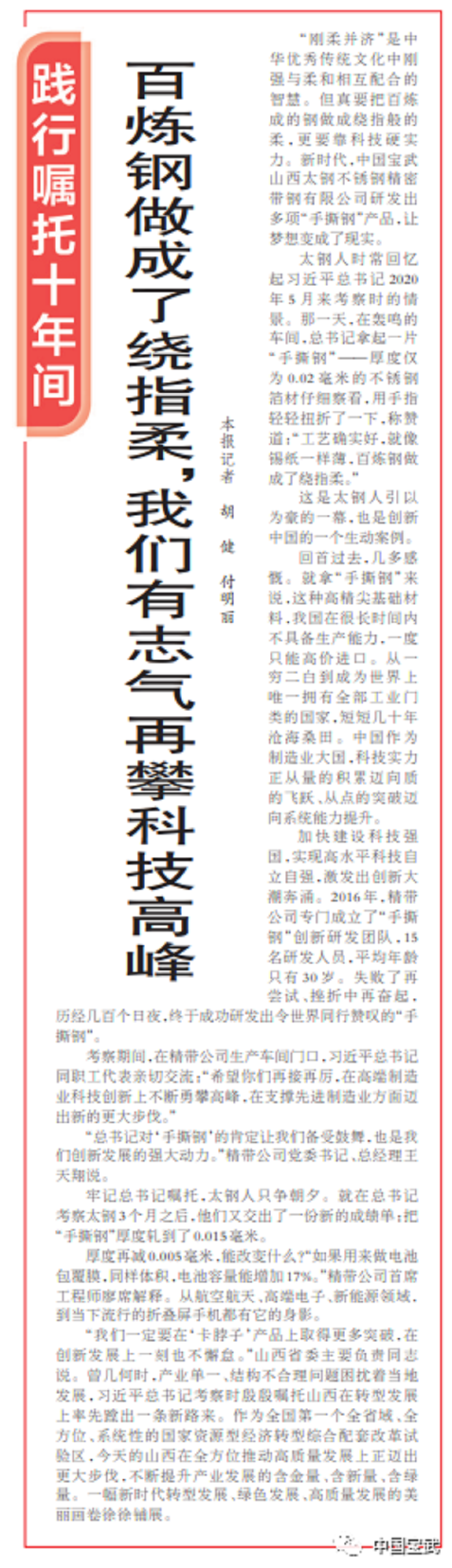 5月26日,人民日?qǐng)?bào)刊發(fā)《百煉鋼做成了繞指柔,我們有志氣再攀科技高峰》,講述習(xí)近平總書記2020年考察調(diào)研太鋼時(shí)稱贊的“手撕鋼”產(chǎn)品,以及太鋼牢記習(xí)近平總書記囑托,只爭(zhēng)朝夕、再創(chuàng)佳績(jī)的故事。我們一起來看這篇報(bào)道——
