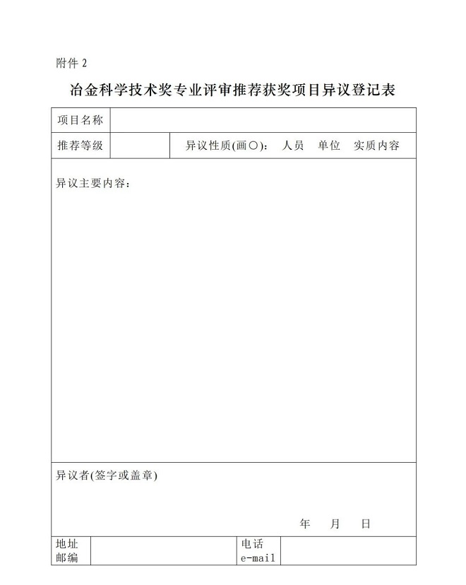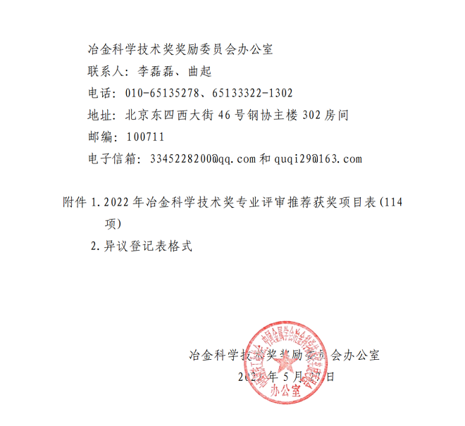 凡對公告項目有異議的,應在公告期內提出。個人異議應署真實姓名,單位異議須加蓋法人單位公章。異議者應按照規定的格式填寫異議登記表,并提供正確有效的聯系方式和相應的客觀證明材料。異議登記表連同有關材料電子版及紙件(一式兩份),請于2022年6月15日前報送至冶金科學技術獎獎勵委員會辦公室。逾期的異議一般不予受理。