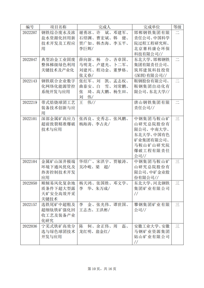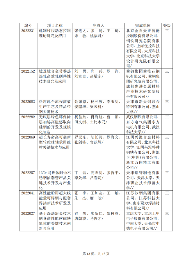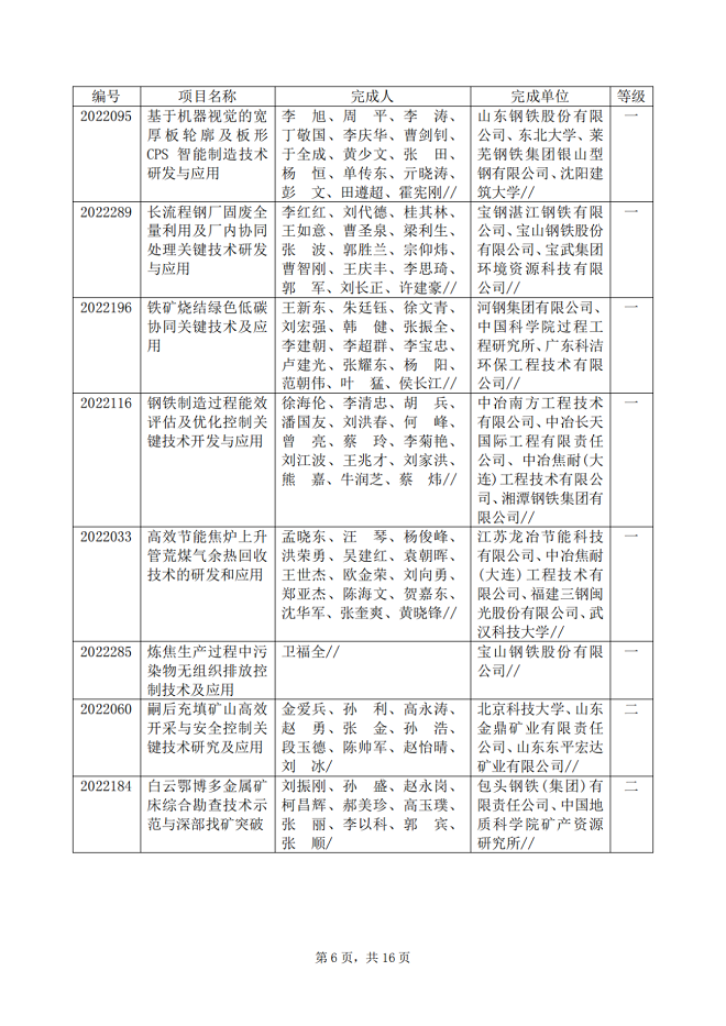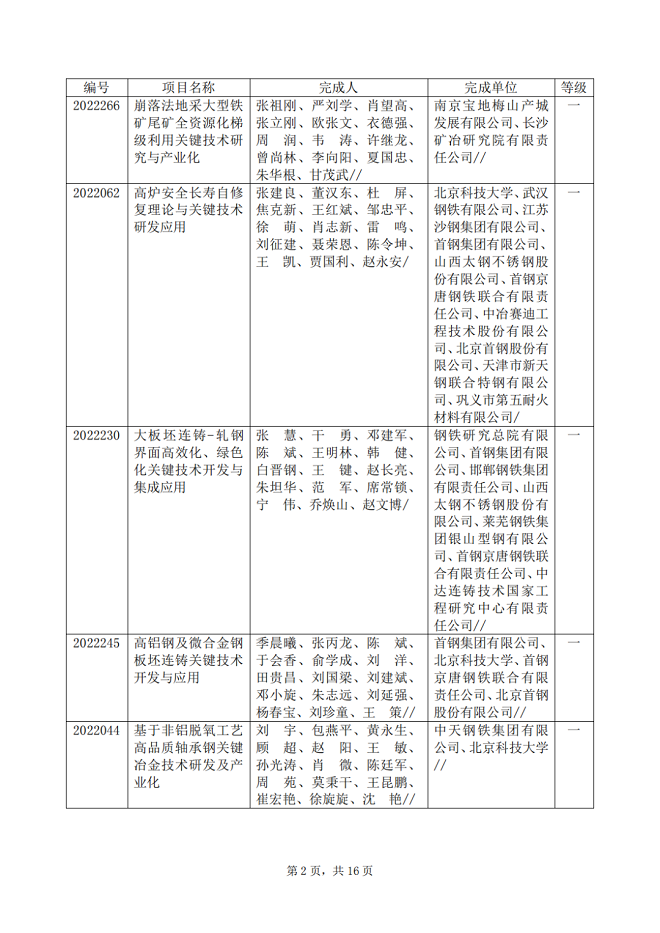 2022年中國鋼鐵工業協會、中國金屬學會冶金科學技術獎(簡稱冶金科學技術獎)專業評審工作已經結束,共推薦獲獎項目114項,其中:特等獎1項,一等獎28項,二等獎26項,三等獎59項。根據評審程序,現將專業評審推薦獲獎項目的名稱、完成單位、完成人、推薦等級等向社會公告。