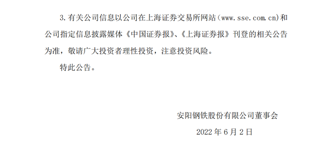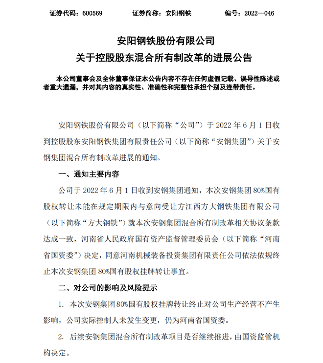 6月1日晚,安陽鋼鐵股份有限公司(以下簡稱公司)發布公告稱,公司于當日收到安鋼集團通知,本次安鋼集團80%國有股權轉讓未能在規定期限內與意向受讓方江西方大鋼鐵集團有限公司就本次安鋼集團混合所有制改革相關協議條款達成一致,河南省人民政府國有資產監督管理委員會(以下簡稱河南省國資委)決定,同意河南機械裝備投資集團有限責任公司依法依規終止本次安鋼集團80%國有股權掛牌轉讓事宜。本次安鋼集團80%國有股權掛牌轉讓終止對公司生產經營不產生影響,公司實際控制人未發生變更,仍為河南省國資委。后續安鋼集團混合所有制改革項目是否繼續推進,由國資監管機構決定。