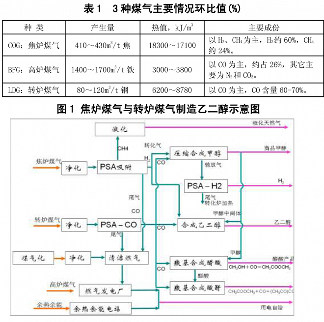 鋼焦融合可實現煤氣資源的高效利用——制造化工產品。鋼焦融合企業產生的焦爐煤氣、高爐煤氣、轉爐煤氣具有各自的發生量、熱值、成分和性能特點(見表1)。