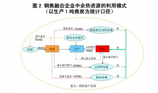 鋼焦融合可實現余熱余能資源的高效利用——余熱余能發電。鋼焦融合企業與獨立的焦化企業相比,增加了更多的優化用能和高效用能條件,提高了余熱余能自發電率。