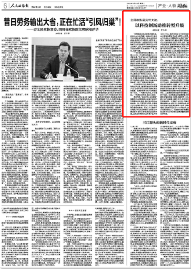 2022年6月28日,《人民政協報》發布了《全國政協委員何文波:以科技創新助推轉型升級》一文。全文如下——
