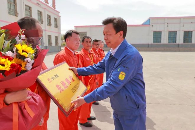2022年4月24日,酒鋼集團黨委書記、董事長陳得信“送獎上崗”現場。(酒鋼 供圖)