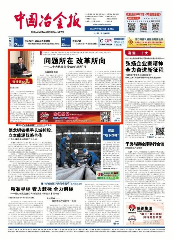 黨的二十大召開在即,萬眾期盼。喜迎盛事,《中國冶金報》特推出《黨的二十大代表風采》欄目,講述來自鋼鐵冶金行業的黨的二十大代表矢志不渝跟黨走、立足崗位砥礪奮進的故事,展現他們履職盡責顯擔當、積極進取奮發作為的黨的二十大代表風采,激勵廣大鋼鐵人奮進新征程,建功新時代。