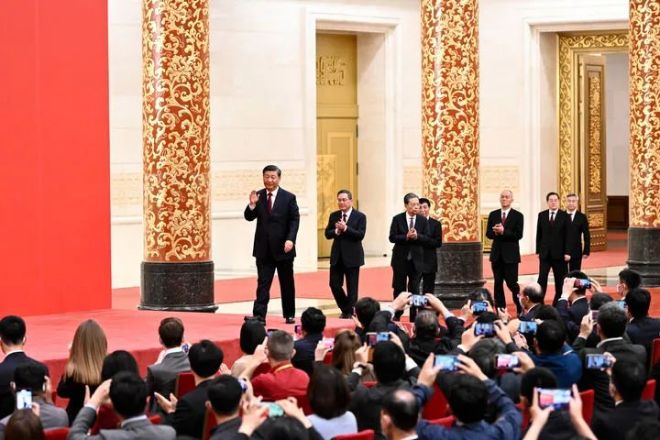 2022年10月23日12時(shí)許,人民大會(huì)堂金色大廳華燈璀璨,氣氛熱烈。中國(guó)共產(chǎn)黨第二十屆中央委員會(huì)總書(shū)記習(xí)近平和中央政治局常委李強(qiáng)、趙樂(lè)際、王滬寧、蔡奇、丁薛祥、李希步入大廳,同采訪黨的二十大的中外記者親切見(jiàn)面。