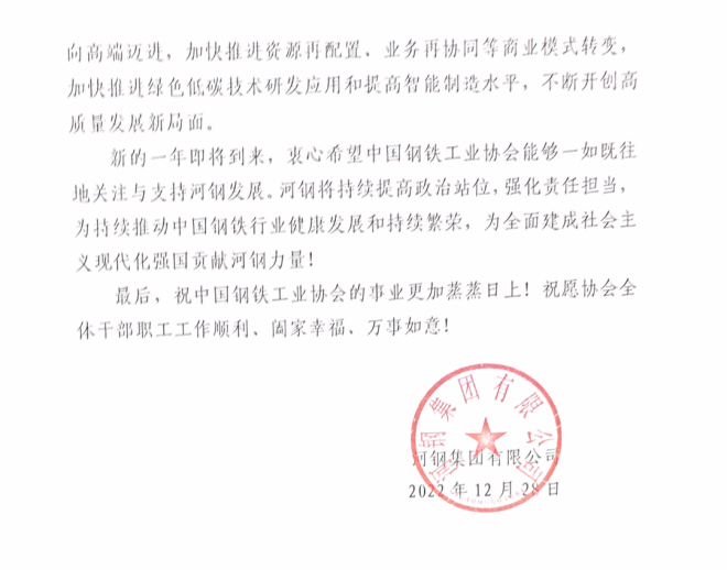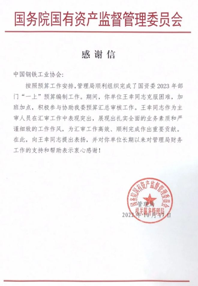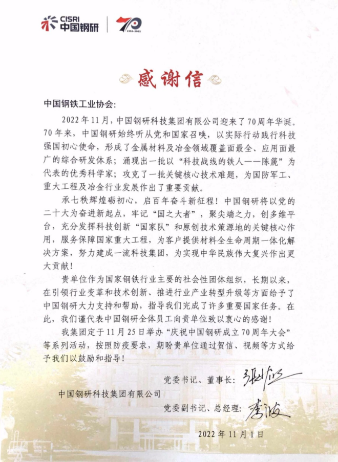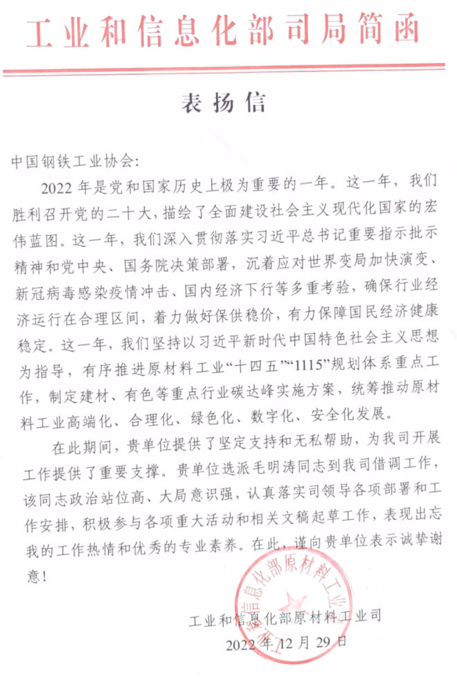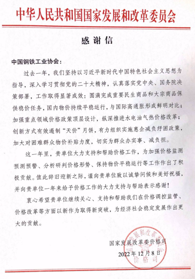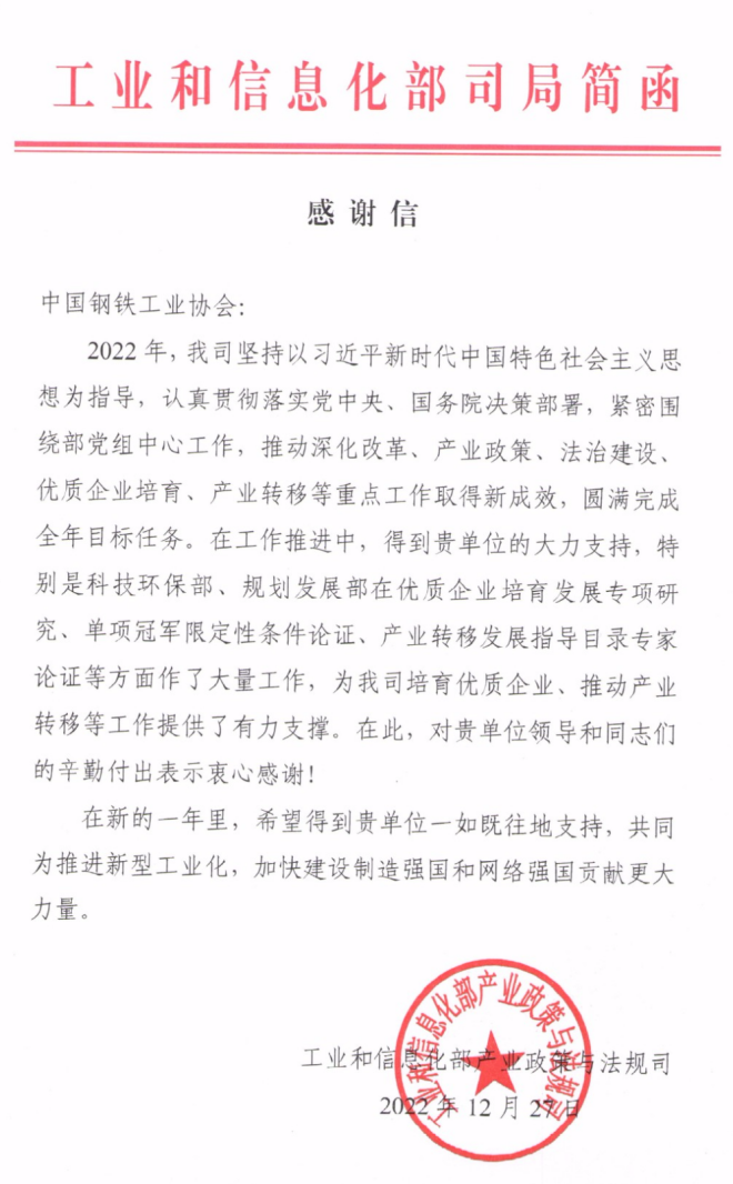 國家發(fā)展改革委、工信部、國資委、河鋼、中國鋼研等向鋼協(xié)發(fā)來感謝信