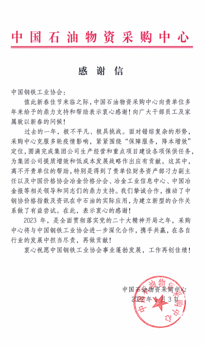 律回春漸,時盛歲新。2022年,國家發(fā)展改革委、工信部、國資委管理局、河鋼集團、中國鋼研、鄭州商品交易所、中國冶金地質總局、中國石油物資采購中心等向中國鋼鐵工業(yè)協(xié)會發(fā)來感謝信,對鋼協(xié)在積極配合支持相關工作開展、凝聚行業(yè)發(fā)展共識、引領行業(yè)變革和技術創(chuàng)新、促進行業(yè)綠色低碳發(fā)展等方面發(fā)揮的作用給予高度評價,對鋼協(xié)提供的大力支持表示誠摯感謝。