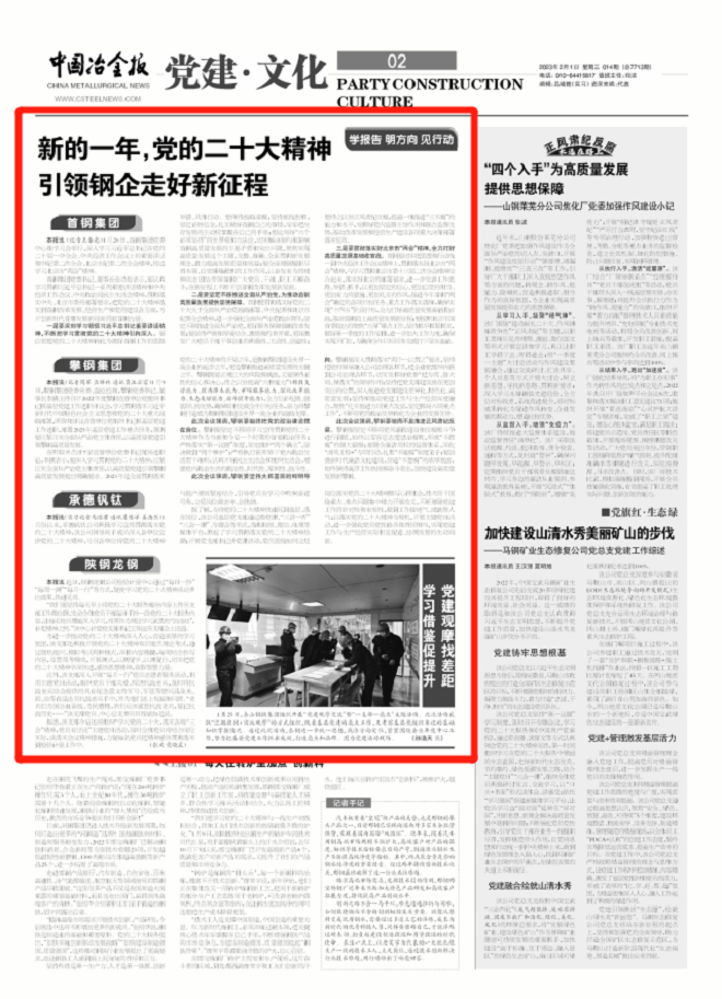 1月份以來,承德釩鈦公司積極學習宣傳貫徹落實黨的二十大精神,該公司領導班子成員深入各單位宣講黨的二十大精神,號召各單位將黨的二十大精神與提產增效緊密結合,引導黨員在學習中吹響奮進號角,立足崗位做表率、創佳績。