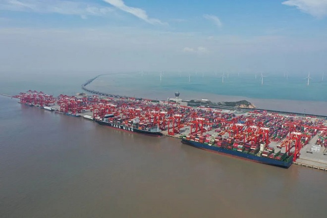 這是2022年9月23日拍攝的上海洋山港集裝箱碼頭(無(wú)人機(jī)照片)。新華社記者 丁汀 攝
