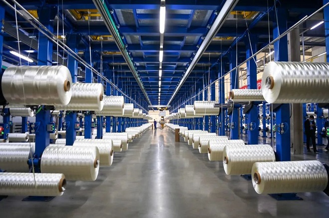在吉林化纖集團(tuán)國(guó)興碳纖維公司生產(chǎn)車(chē)間,工人在整理碳纖維原絲(2022年10月31日攝)。新華社記者 顏麟蘊(yùn) 攝