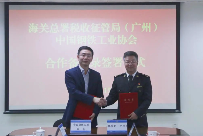 3月15日,中國鋼鐵工業協會與海關總署稅收征管局(廣州)合作備忘錄簽署儀式在廣州舉行,中國鋼鐵工業協會黨委常委、副會長唐祖君和海關總署稅收征管局(廣州)局長譚武分別致辭并在合作備忘錄上簽字。海關總署稅收征管局(廣州)二級總監陳綠薇、陳國耀,鋼協總經濟師王穎生和相關部門同志參加了簽署儀式。