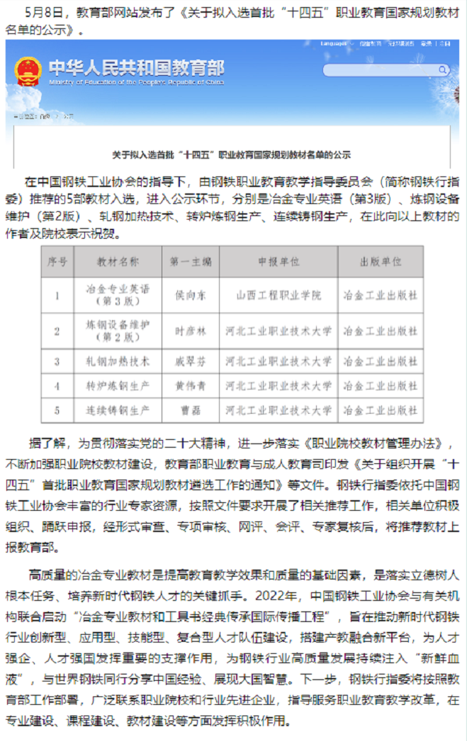 5部教材由鋼鐵行指委推薦入選首批“十四五”職業教育國家規劃教材公示名單