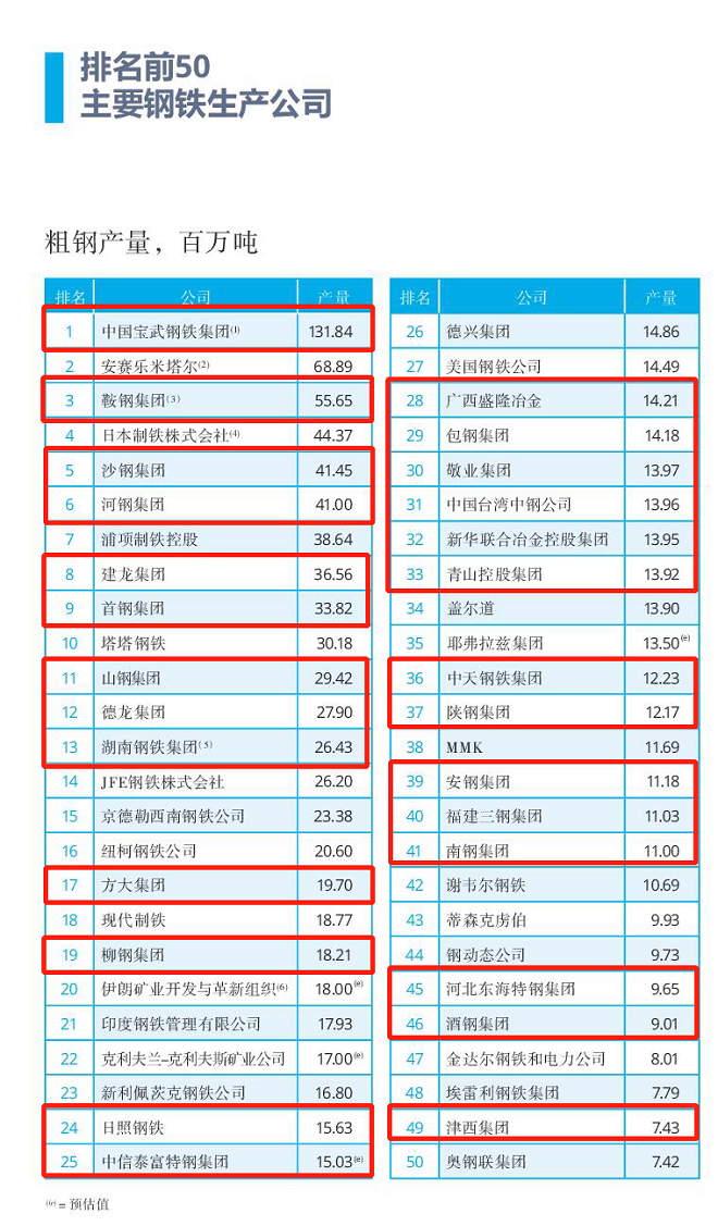 根據(jù)2022年的粗鋼產(chǎn)量數(shù)據(jù)顯示,世界主要鋼鐵生產(chǎn)公司排名前50中,有27家中國鋼鐵企業(yè)。在世界鋼鐵生產(chǎn)公司排名前10中,有6家中國鋼企,分別是中國寶武、鞍鋼集團(tuán)、沙鋼集團(tuán)、河鋼集團(tuán)、建龍集團(tuán)、首鋼集團(tuán)。