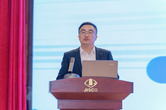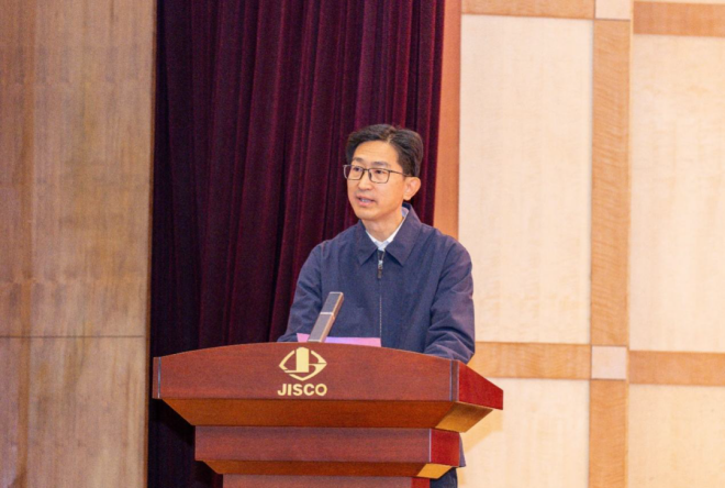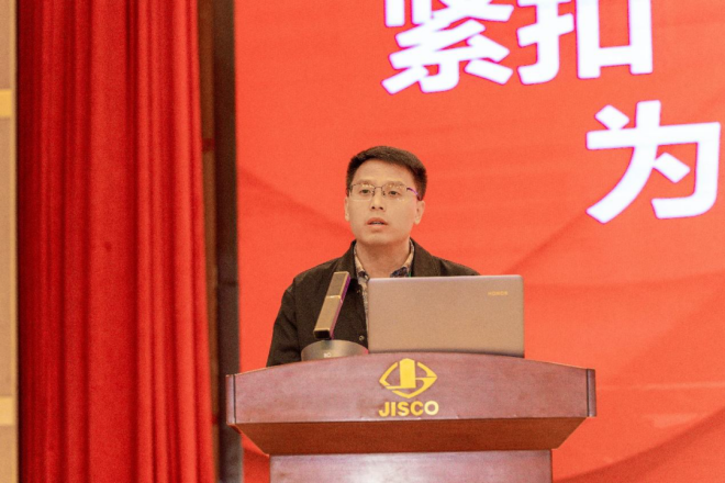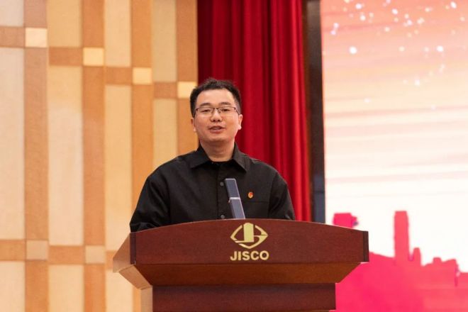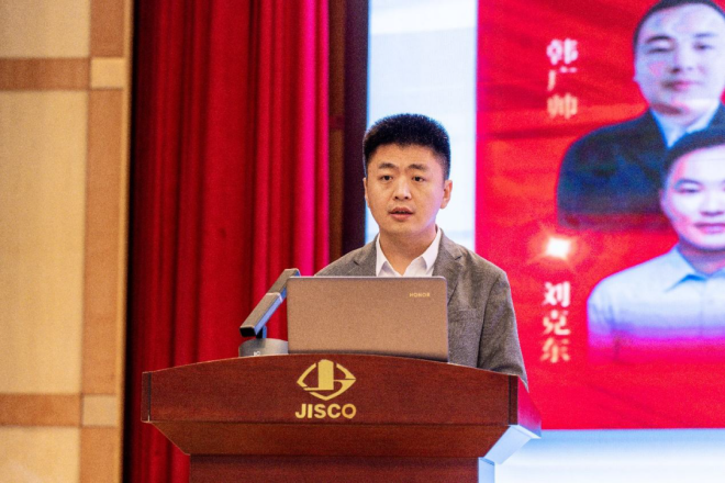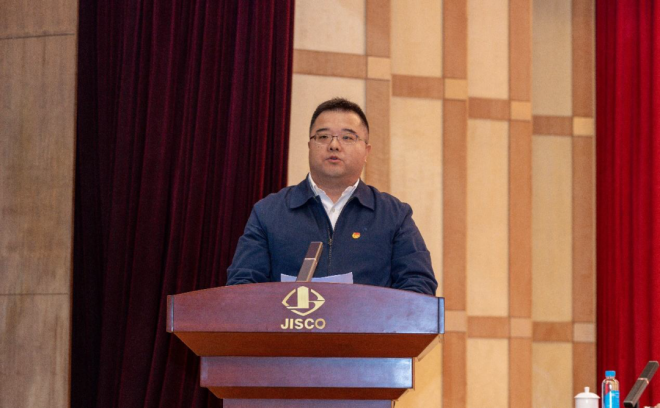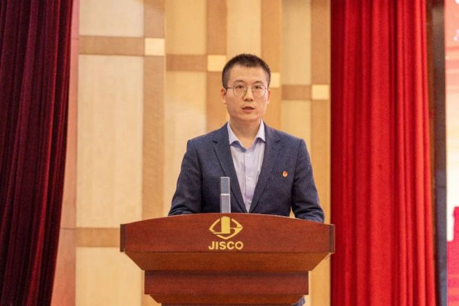 圖為金占雄作題為《聚焦企業戰略目標,創新人才工作機制,用青年力量“火種”點燃酒鋼高質量發展“引擎”》的主旨報告