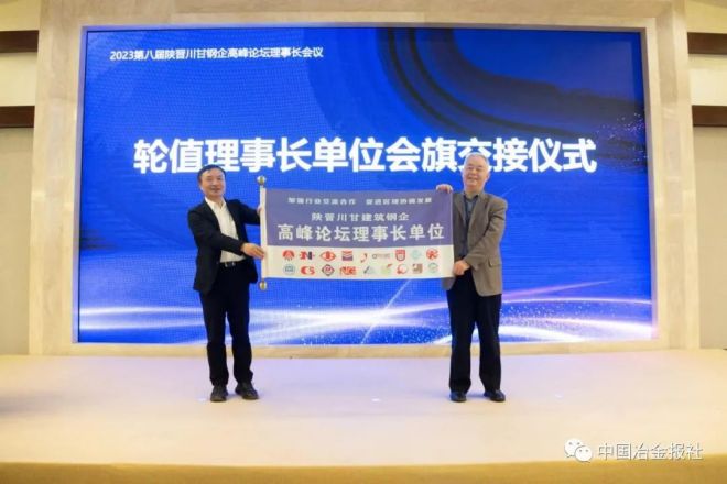 會議舉行了輪值理事長單位會旗交接儀式。第九屆輪值理事長單位為陜鋼集團,王勁、楊海峰上臺進行了會旗交接。