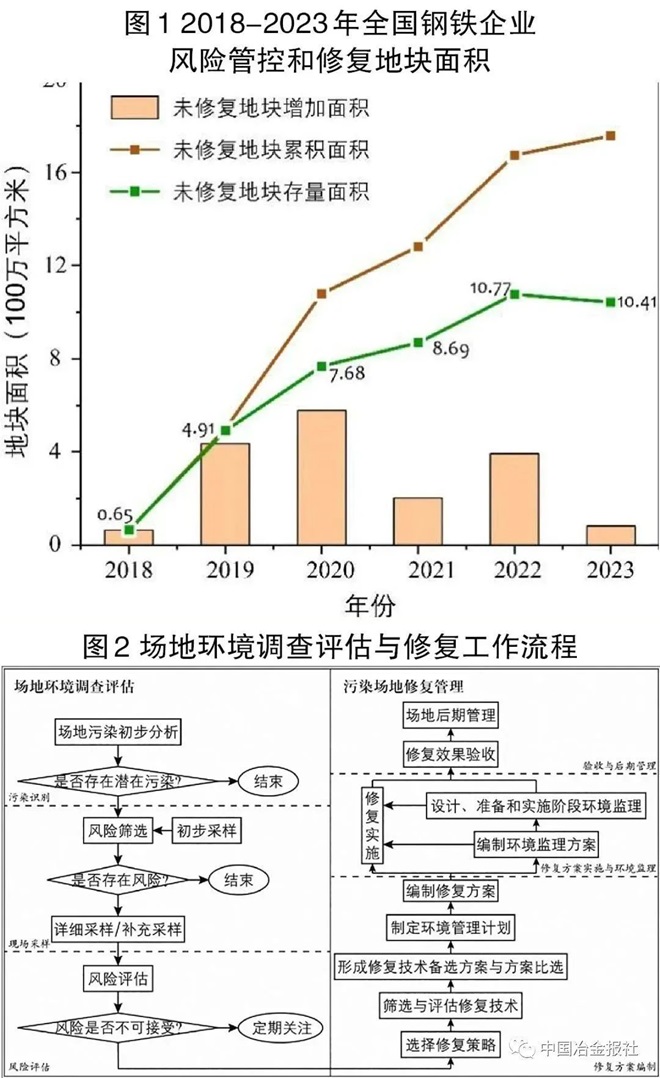 根據全國31個?。ㄗ灾螀^、直轄市)最新公布的建設用地土壤污染風險管控和修復名錄(見圖1),2023年全國鋼鐵企業風險管控和修復地塊總面積為1756.85萬平方米,已完成風險管控和修復的地塊面積為715.52萬平方米,占總面積的40.73%;2022年后,未完成風險管控和修復的存量地塊面積呈現下降趨勢??梢钥闯?,鋼鐵企業正在積極打響凈土保衛戰,治理和修復工作已取得一定成果。