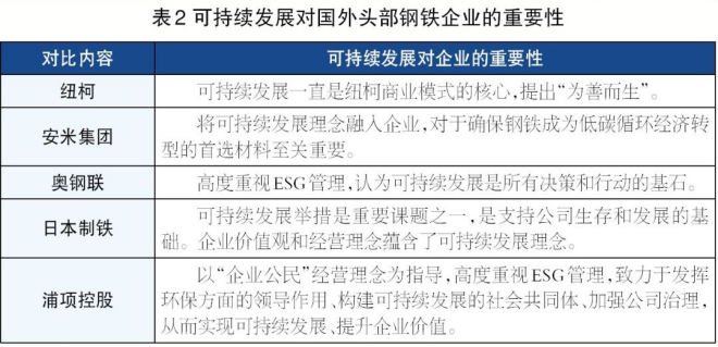 5家國外頭部鋼鐵企業(yè)均高度重視ESG管理,將可持續(xù)發(fā)展理念融入企業(yè)發(fā)展戰(zhàn)略、日常經(jīng)營中,ESG在各企業(yè)中的重要性如表2所示。