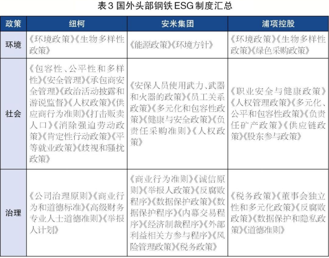 此外,為更好地約束企業(yè)行為,切實踐行可持續(xù)發(fā)展理念,紐柯、安米集團以及浦項控股還制訂了完善的ESG制度體系,并且持續(xù)根據(jù)ESG相關(guān)全球倡議進行修訂,具體如表3所示。例如,安米集團的可持續(xù)發(fā)展政策涵蓋了人權(quán)、反腐敗、沖突礦產(chǎn)、商業(yè)行為、負(fù)責(zé)任采購、健康與安全及環(huán)境等方面,浦項控股形成了包含環(huán)境、社會和治理3個維度共計14個具體制度的政策手冊。