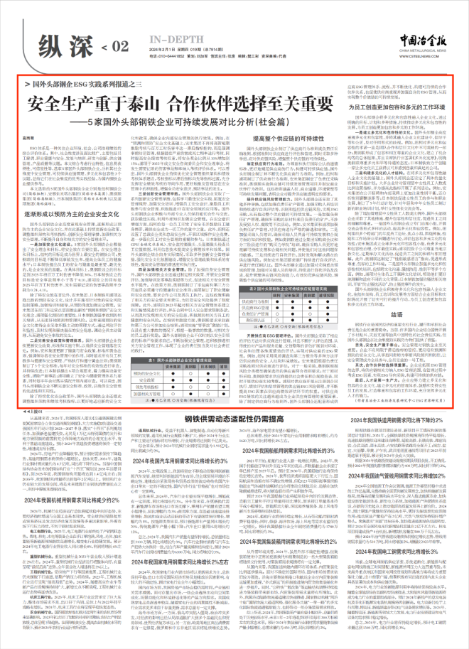 ESG體系是一種關注企業環境、社會、公司治理績效的綜合評價體系。其中,社會維度涉及面比較廣,主要包括員工雇傭、職業健康與安全、發展與培訓、研發與創新、供應鏈管理、產品質量等議題。本文綜合考慮行業特性、信息易獲得性、可借鑒性等,選取5家國外頭部鋼鐵企業,分析其社會維度中安全管理、可持續供應鏈管理、多元化和包容性3個議題,總結它們在社會維度的優秀實踐經驗,為國內鋼鐵企業提供參考。