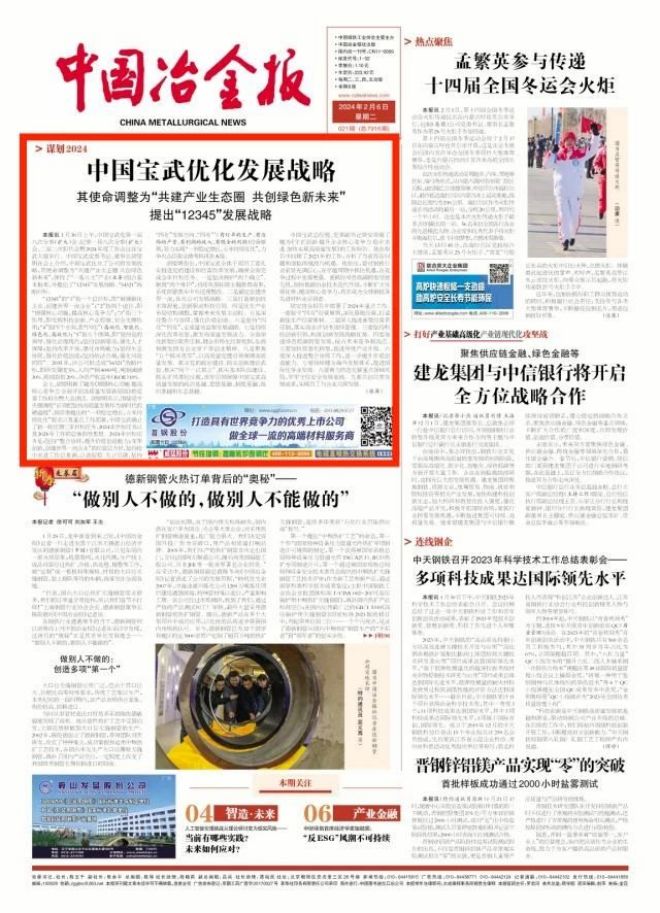 1月30日上午,中國寶武黨委一屆八次全委(擴大)會、紀委一屆八次全委(擴大)會、二屆二次職代會暨2024年度工作會議在寶武大廈舉行。中國寶武黨委書記、董事長胡望明在會上介紹,中國寶武優(yōu)化了公司的發(fā)展戰(zhàn)略,其使命調(diào)整為“共建產(chǎn)業(yè)生態(tài)圈 共創(chuàng)綠色新未來”,保持了“一基五元”產(chǎn)業(yè)(業(yè)務(wù))組合基本框架,并提出了“12345”發(fā)展戰(zhàn)略、“54321”戰(zhàn)略目標。