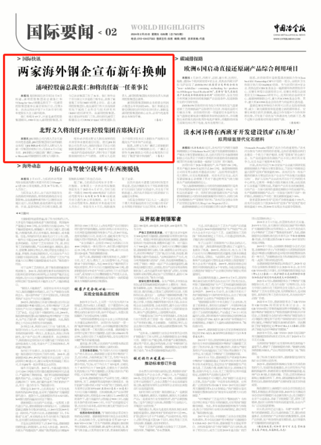 本報訊 JFE鋼鐵公司內(nèi)部人員2月22日向筆者透露,JFE控股集團(tuán)將任命其鋼鐵業(yè)務(wù)部門(JFE鋼鐵公司)負(fù)責(zé)人北野義久為新一任集團(tuán)首席執(zhí)行官,任命自4月1日起生效。JFE鋼鐵公司副總裁廣瀨正之(Hirose Masayuki)將接替擔(dān)任北野義久現(xiàn)職務(wù)。