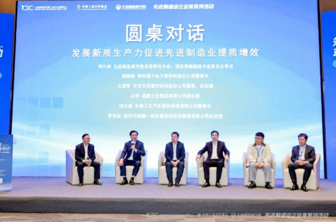 企業家圓桌會議亦同期順利進行。常州強力電子新材料股份公司董事長錢曉春,北京天瑪智控科技股份公司董事、總經理王進軍,福建三安集團有限公司副總裁占卓,長春三友汽車部件制造公司董事長、總經理白大成,深圳市鯤鵬一創私募股權投資管理有限公司總經理羅再宏圍繞“發展新質生產力,促進先進制造業提質增效”話題展開探討,國家智能制造專家委員會委員、工業和信息化部電子科技委政策組副組長劉九如主持了圓桌對話。