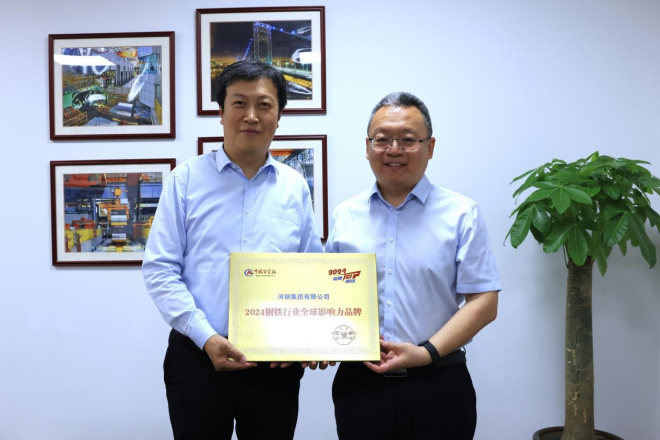 圖為范鐵軍向李炳軍頒發中國冶金報社評選的河鋼集團2024全球影響力品牌獎牌