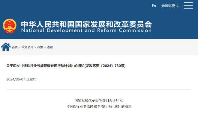 6月7日,國(guó)家發(fā)展改革委發(fā)布了關(guān)于印發(fā)《鋼鐵行業(yè)節(jié)能降碳專項(xiàng)行動(dòng)計(jì)劃》的通知。
