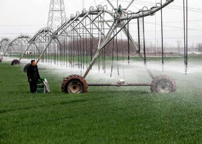 2024年3月18日,在河南省焦作市博愛縣孝敬鎮東原莊村瑞輝家庭農場,村民使用全自動指針式噴灌機進行澆灌作業。新華社發(程全攝)