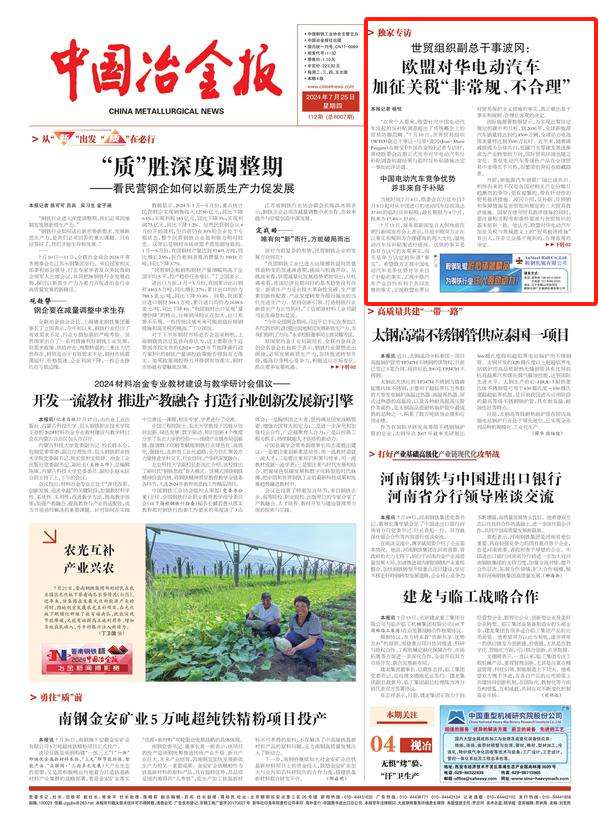 7月10日,世界貿易組織(WTO)副總干事讓-馬里·波岡(Jean-Marie Paugam)在接受《中國冶金報》記者專訪時表示,中國鋼鐵在中國國際貿易中可以稱作為系統性的參與者,表現可圈可點。低碳化是國際貿易面臨的挑戰,中國鋼鐵在應對這一挑戰方面走在了國際前列,值得贊許。
