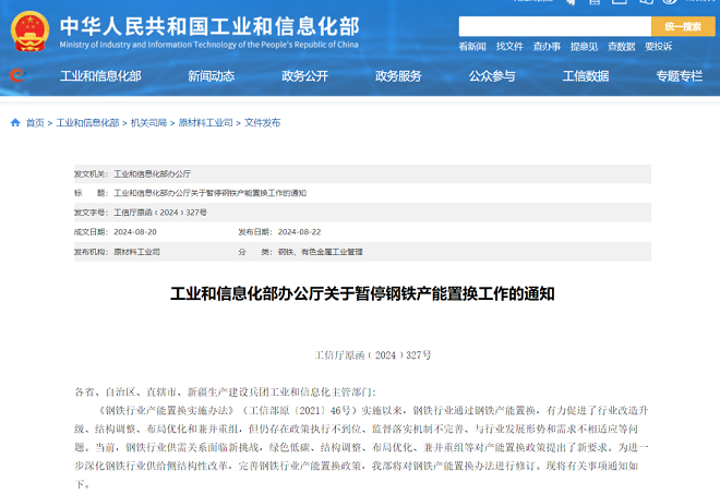 工信部日前發布關于暫停鋼鐵產能置換工作的通知(點擊查看更多:《重磅!工信部:暫停鋼鐵產能置換》),要求各地區自2024年8月23日起,暫停公示、公告新的鋼鐵產能置換方案,未按要求繼續公示的,則將視為違規新增鋼鐵產能,并作為反面典型進行通報。