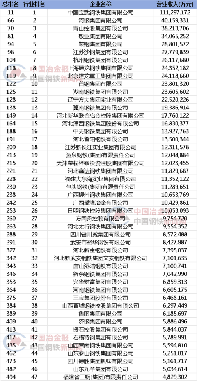 經(jīng)《中國(guó)冶金報(bào)》、中國(guó)鋼鐵新聞網(wǎng)記者梳理,在2024中國(guó)企業(yè)500強(qiáng)名單中,鋼鐵(黑色冶金)行業(yè)共47家上榜。