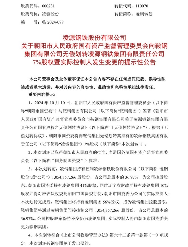 凌鋼股份10月10日晚間發布公告稱,朝陽市國資委與鞍鋼集團簽署《無償劃轉協議》,約定朝陽市國資委將向鞍鋼集團無償劃轉其持有的凌鋼集團 7%股權。本次劃轉已取得朝陽市人民政府的批準,尚需國務院國資委批準。