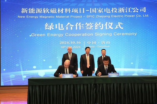 新能源軟磁材料項目,遷西縣委副書記、縣政府縣長田文學,安米集團副總裁、中國區首席執行官桑杰·沙瑪,中國東方集團執行董事兼首席財務官韓力分別代表三方簽約;綠電項目,安米集團中國區戰略項目總經理費爾南多·特謝拉與國家電投集團浙江公司黨委書記、董事長李強分別代表雙方簽約。