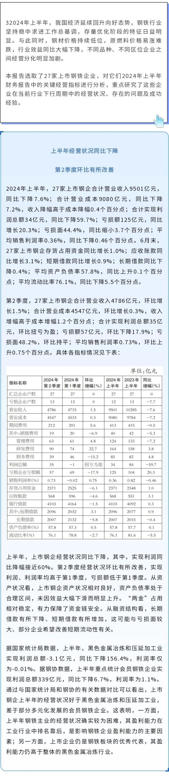從2024年上半年國內重點上市鋼企經營狀況看盈利關鍵詞:發揮優勢 強化研發 管控成本