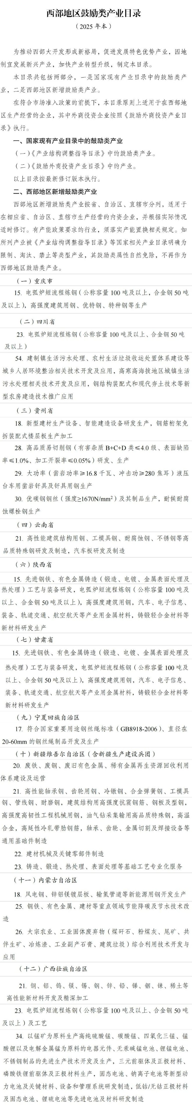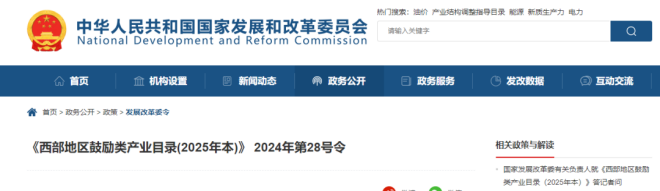 近日,國家發(fā)展改革委修訂出臺《西部地區(qū)鼓勵類產(chǎn)業(yè)目錄(2025年本)》。