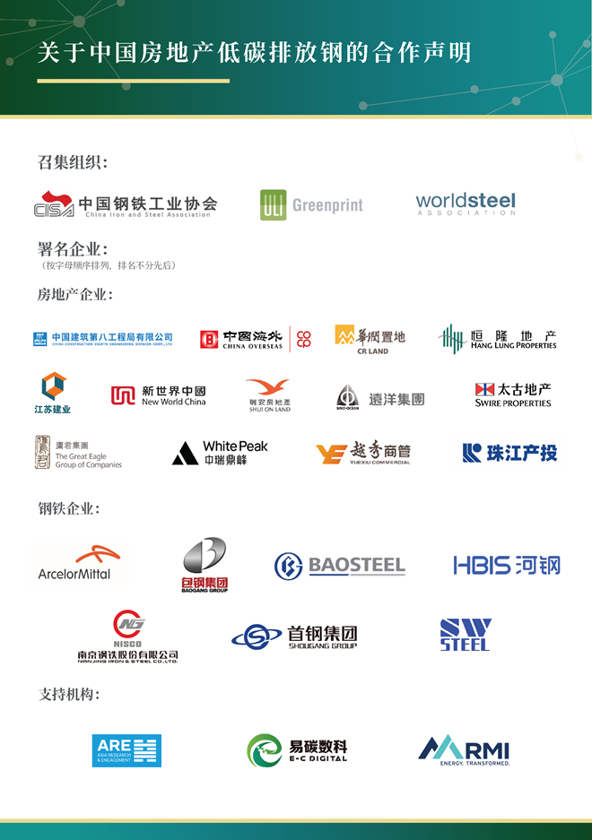 來自世界鋼鐵協(xié)會的會員企業(yè)中國寶武集團寶鋼股份、河鋼集團、首鋼集團、南鋼集團、包鋼集團以及安賽樂米塔爾等企業(yè)簽署了《合作聲明》,首批簽署的企業(yè)及機構還包括恒隆地產、太古地產、瑞安地產、遠洋集團等領先的房地產開發(fā)企業(yè)和相關支持機構。