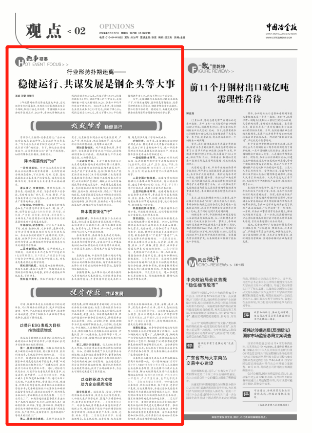 三是政策悉知。多方了解和掌握與企業(yè)生存發(fā)展相關(guān)的宏觀經(jīng)濟(jì)形勢(shì)以及國際、國家、地方政府出臺(tái)的各類相關(guān)政策文件。知悉產(chǎn)能產(chǎn)量類政策,包括《鋼鐵行業(yè)產(chǎn)能置換實(shí)施辦法》《關(guān)于促進(jìn)鋼鐵工業(yè)高質(zhì)量發(fā)展的指導(dǎo)意見》《鋼鐵行業(yè)穩(wěn)增長(zhǎng)工作方案》以及粗鋼產(chǎn)量調(diào)控、鋼鐵企業(yè)冶煉裝備摸底等方面的政策文件。知悉綠色發(fā)展類政策,包括超低排放改造進(jìn)展與績(jī)效分級(jí)政策調(diào)控、能耗雙控、碳排放雙控、綠色工廠等方面的政策,及時(shí)掌握國家及地方對(duì)鋼鐵企業(yè)綠色發(fā)展的政策要求。知悉數(shù)字類政策,包括智能制造評(píng)價(jià)、數(shù)字經(jīng)濟(jì)、數(shù)據(jù)要素×等方面的政策文件,借助數(shù)字化手段實(shí)現(xiàn)降本。