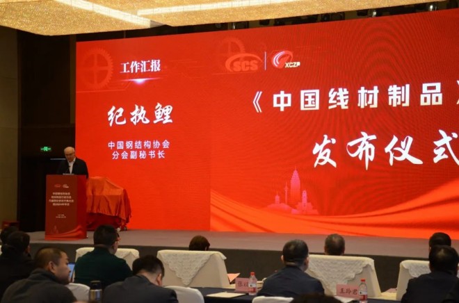 12月17日,在中國鋼結構協會線材制品行業分會(下稱制品分會)八屆四次會員代表大會暨2024年年會上,隨著中國鋼鐵工業協會副總工程師黃導,冶金工業出版社黨委副書記、副社長(主持工作)、總編輯陳琢,江蘇省鋼鐵行業協會副會長兼秘書長陳洪冰,制品分會2024年輪值理事長顧其林(江蘇狼山鋼繩股份有限公司董事長、黨委書記)、2025年輪值理事長董東(法爾勝泓昇集團副總裁)、執行理事長劉喆、顧問徐寅(鋼協原發展與科技環保部副主任)共同按下啟動鍵,《中國線材制品》新書正式發布。