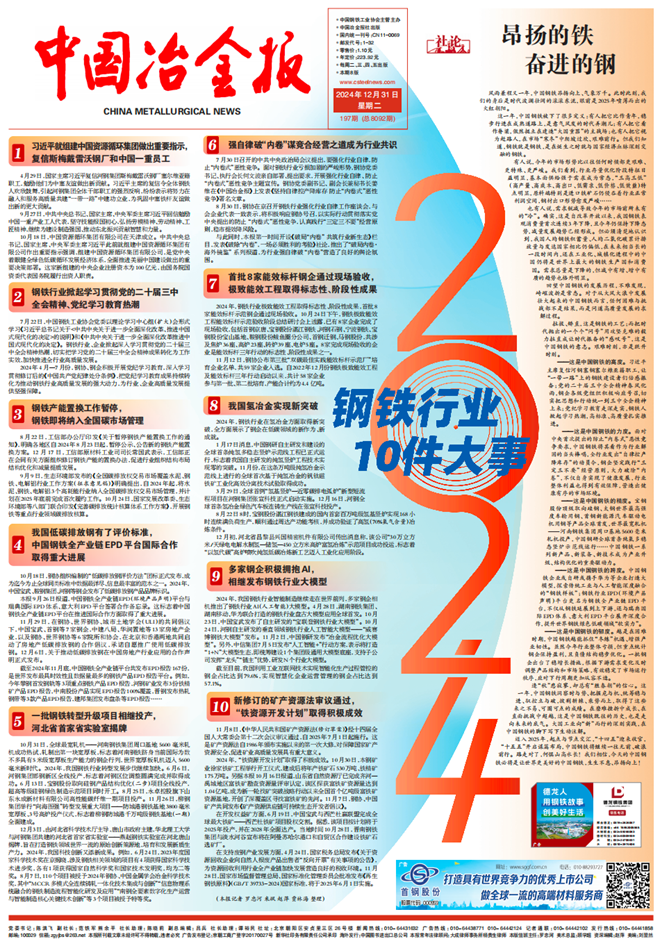 12月3日,由河北省科學(xué)技術(shù)廳主導(dǎo),唐山市政府主建,華北理工大學(xué)與河鋼集團(tuán)共建的河北省首家省實(shí)驗(yàn)室——燕趙鋼鐵實(shí)驗(yàn)室在河北唐山揭牌,旨在打造鋼鐵領(lǐng)域世界一流的原始創(chuàng)新策源地,培育和發(fā)展新質(zhì)生產(chǎn)力。2024年,我國(guó)科技創(chuàng)新又添新成果。例如, 6月24日,2023年度國(guó)家科學(xué)技術(shù)獎(jiǎng)在京揭曉,涉及鋼鐵相關(guān)領(lǐng)域的項(xiàng)目有4項(xiàng)獲得國(guó)家科學(xué)技術(shù)進(jìn)步獎(jiǎng),各有1項(xiàng)獲得國(guó)家自然科學(xué)獎(jiǎng)和國(guó)家技術(shù)發(fā)明獎(jiǎng),均為二等獎(jiǎng)。8月7日, 110個(gè)項(xiàng)目被授予2024年鋼協(xié)、中國(guó)金屬學(xué)會(huì)冶金科學(xué)技術(shù)獎(jiǎng),其中“MCCR多模式全連續(xù)鑄軋一體化技術(shù)集成與創(chuàng)新”“信息物理系統(tǒng)融合的鋼鐵制造流程智能化研發(fā)及應(yīng)用”“南鋼全要素?cái)?shù)字化生產(chǎn)運(yùn)營(yíng)與智能制造核心關(guān)鍵技術(shù)創(chuàng)新”等3個(gè)項(xiàng)目被授予特等獎(jiǎng)。