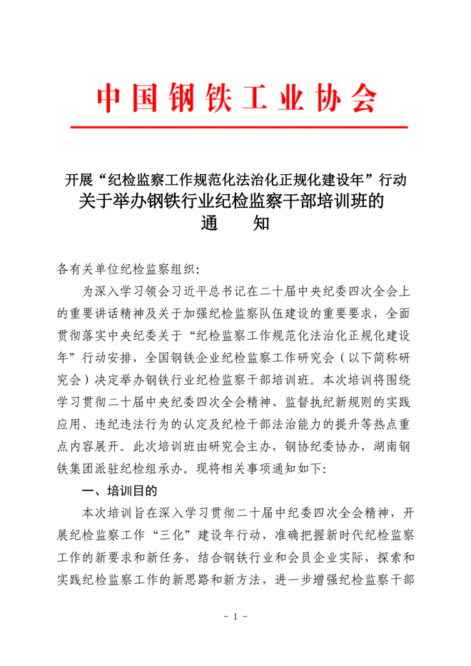 關于舉辦鋼鐵行業紀檢監察干部培訓班的通知