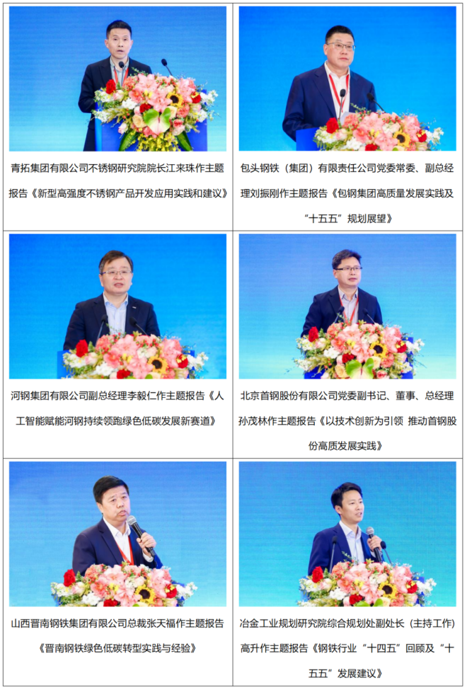 會上,青拓集團有限公司不銹鋼研究院院長江來珠,包頭鋼鐵(集團)有限責任公司黨委常委、副總經理劉振剛,河鋼集團有限公司副總經理李毅仁,北京首鋼股份有限公司黨委副書記、董事、總經理孫茂林,山西晉南鋼鐵集團有限公司總裁張天福先后做企業經驗交流。冶金工業規劃研究院綜合規劃處副處長 (主持工作) 高升作主題報告。