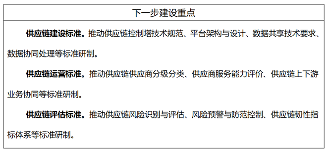 主要包括供應鏈風險識別與評估、風險預警與防范控制等風險評估標準;供應鏈韌性指標體系、測試與評估方法等性能評估標準。