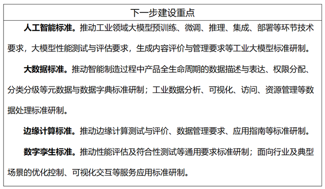 主要包括智能檢測與裝配裝備的組成要素、參數配置、功能和性能要求等通用技術標準;數據接口、適配要求、集成規范等接口與通信標準。