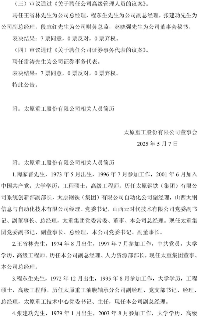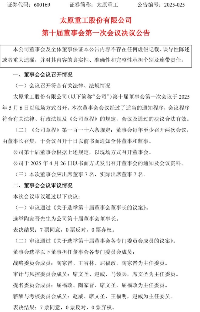 5月7日,太原重工發布公告稱,2025年5月6日,第十屆董事會第一次會議審議通過《關于選舉第十屆董事會董事長的議案》,選舉陶家晉先生為公司第十屆董事會董事長。