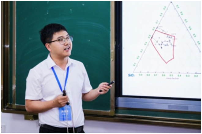 ▲蘭州理工大學景建發作題為“釩鈦磁鐵礦電爐冶煉過程CaO-MgO-SiO2-13%Al2O3-50%TiO2五元渣系相平衡研究”的報告